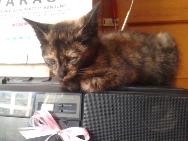 Then a few nights ago, another neighbour kids gave us another new kitten. It's much smaller and some mother cat (that used to be ours but is now everyone's) kept hitting it so they decided to keep it at our house. My sisters were here so they of course didn't reject the offer. My grandma unwillingly accepted it but the problem was the older territorial kitty. It kept hissing at the new kitten. So we had to put it inside the house in the living room. We had to do that for several days until we decided that the older one has got used to the presence of another cat. Until one day, they actually shared the same place to sleep. They still fought but it's friendlier than before.
